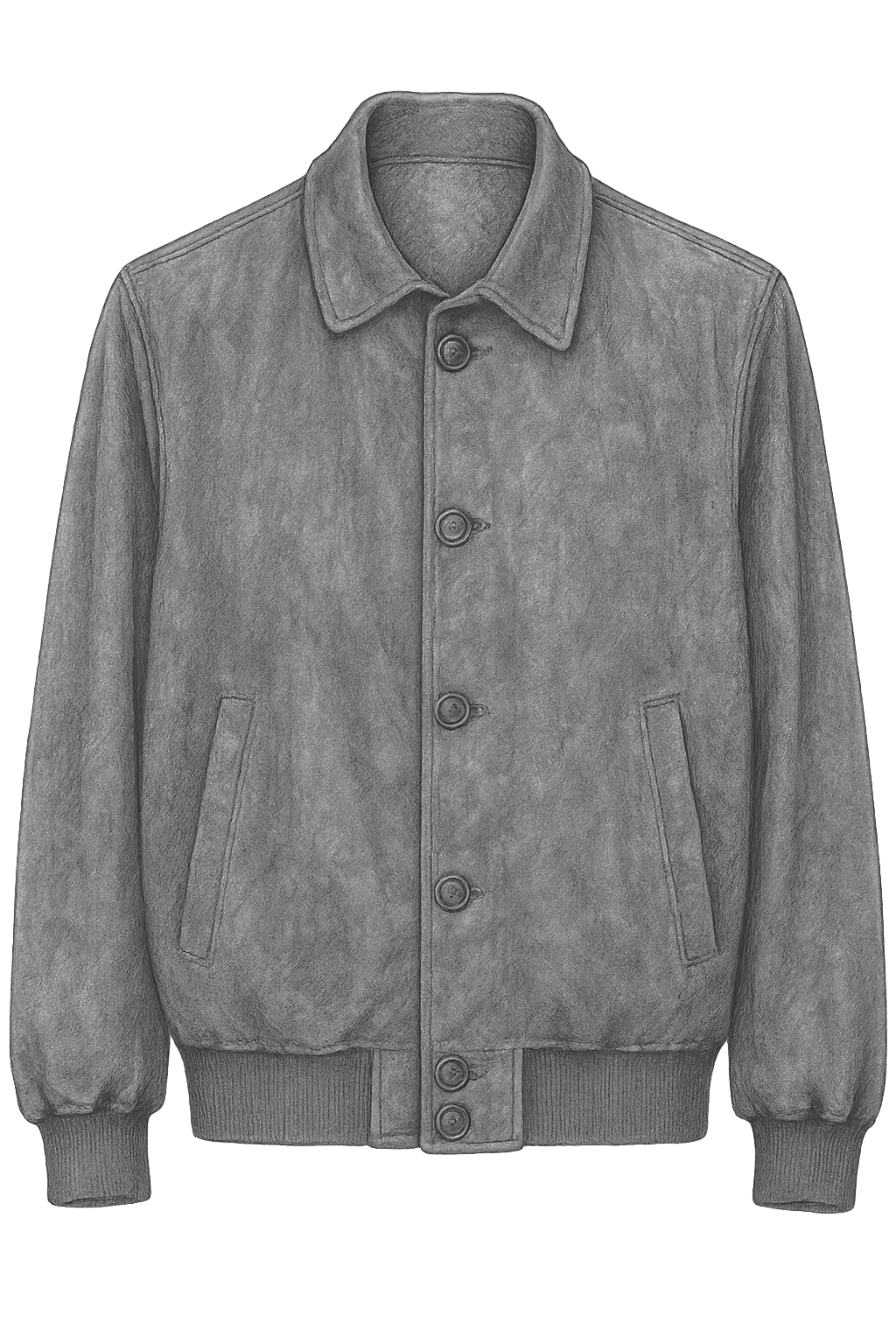 Button-up varsity jacket with a shirt collar, ribbed hem and cuffs. Clean front with welted pockets. Structured silhouette, blending casual utility with timeless simplicity.